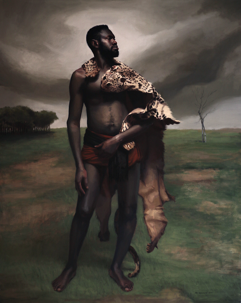 When I was a child my father used to read to me the hunting stories by Jim Corbett, a great British ‘shikari’ and a naturalist. Stories like ‘Man-Eaters Of Kumaon’ and ‘The Man-eating Leopard of Rudraprayag’ simply held me spellbound. One attribute of Jim Corbett for ‘the king of the jungle’ kept fascinating me through out my life, “The lion is a great-hearted gentleman of the jungle and would never attack a human being unless provoked”. In the light of this one can easily gauge that ironically it is not only a ‘shikari’ who comes out successful in killing the animal but sometime falls a prey to the animal himself. It is out of this strange tussle that I always wanted to paint a man as a ‘shikari’. For this painting, I made the model stand in the contrapposto pose, to depict heroic grace and pride.