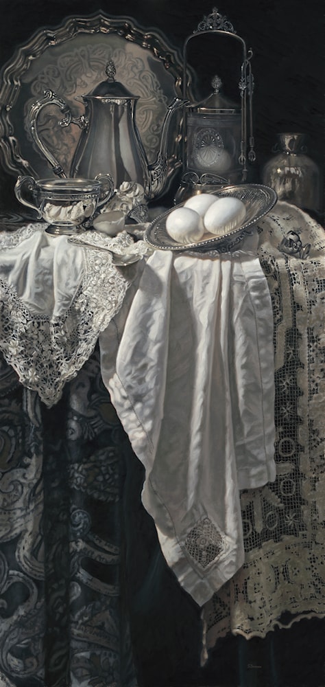 I am inspired by traditional Dutch Still Life painting and this piece is a sort of homage to the tradition. It's a casual arrangement of a breakfast table with eggs, a teapot and silver pieces set up on a lavishly covered table. The dish with the eggs is tipped, as was common in the genre, to show the contents better. This dish becomes the center of attention with everything else guiding your eye towards it. The smoothness and simplicity of the eggs contrast with the lush textures and patterns of the fabrics and silver. I love working with almost monochromatic colors, showing the richness