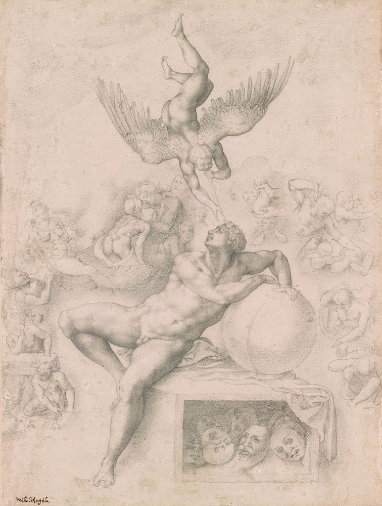 Michelangelo struggled greatly with the world around him, which can be seen most clearly in his drawing of Il Sogno, The Dream of Human Life, as well as in his poetry.13 In this drawing, the central figure appears to be falling over a box, leaning all his weight on a great sphere that looks as though it might roll off the edge, certainly causing the figure to fall. In the box are masks, images of falsehoods and facades, while the central figure himself is surrounded by figures that are fighting, thinking, eating, and making love. From the heavens, an angel descends, blowing a horn directly into the central figures face. The figure appears to be both frightened and overwhelmed.