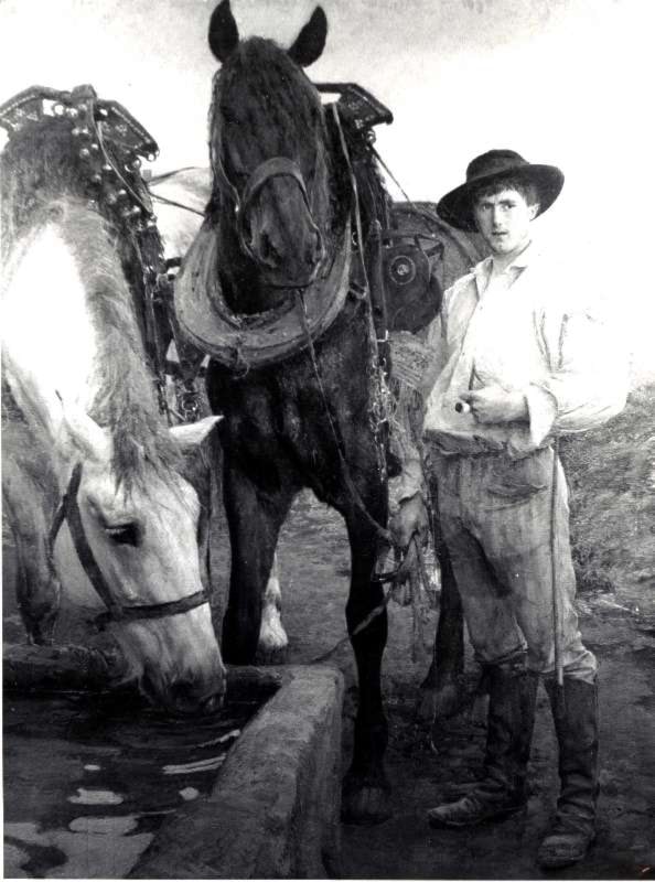 The horses were photographed in an interior courtyard with a single figure, M. Walter, holding the animals' reins. In the completed painting Dagnan developed his scene against an expansive landscape and replaced the well-dressed M. Walter with a field laborer who had just brought the horses to a watering trough at the close of the day, creating the illusion that these horses were directly related to field work-despite the fact that they are obviously not quarter horses. Rather, they are more delicate animals who were employed in pulling M. Walter's carriage through the countryside. Thus, Dagnan carefully altered reality to suit his own artistic purpose.