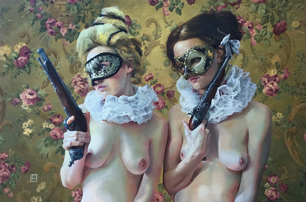 This work was inspired by histories of actual female duels, I then expounded on that idea by imagining it as the basis for a theatre play or opera.
