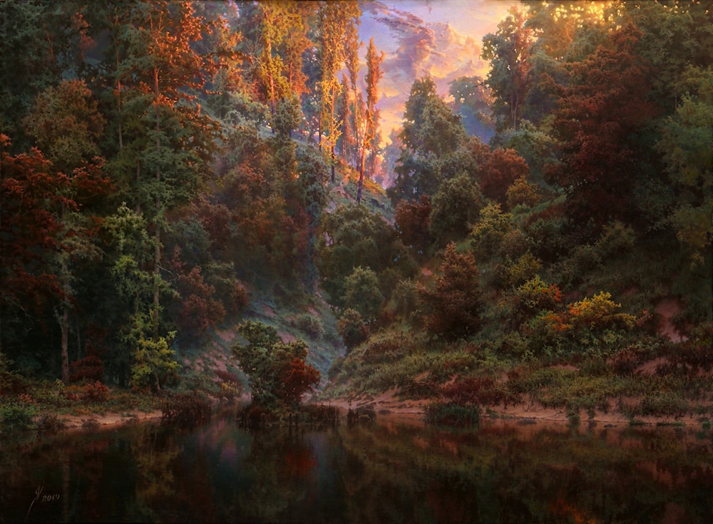 In development of this work I used graduations of numerous landscape forms created by me in groups with a degree of contrast and strengthening of a cold tint on the level above the water and also strengthening of a warm tint on the level of the top elements of the composition where a warm diffused light is possible.