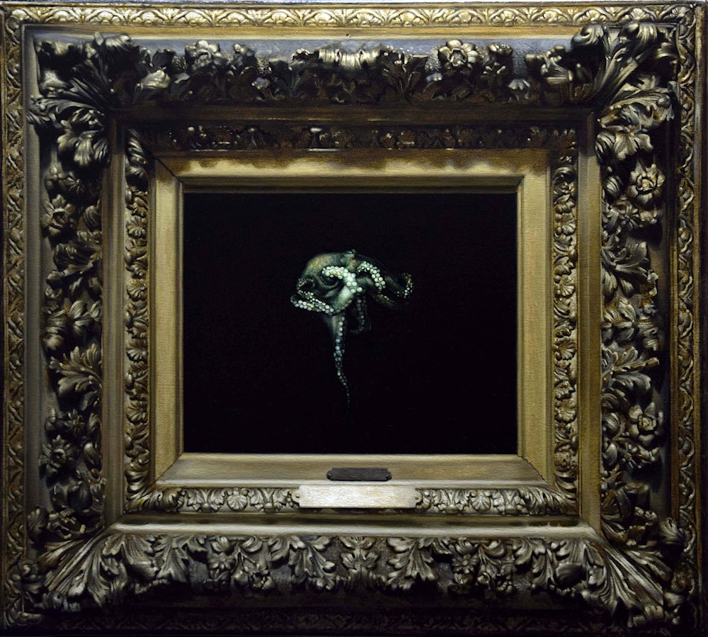 The painting is called “Inner Worlds” and suggests the idea of submerging ourselves into the depths of our unconsciousness as we would dive into a dark sea, into places where the sun’s light will never reach and where mysterious creatures inhabit.