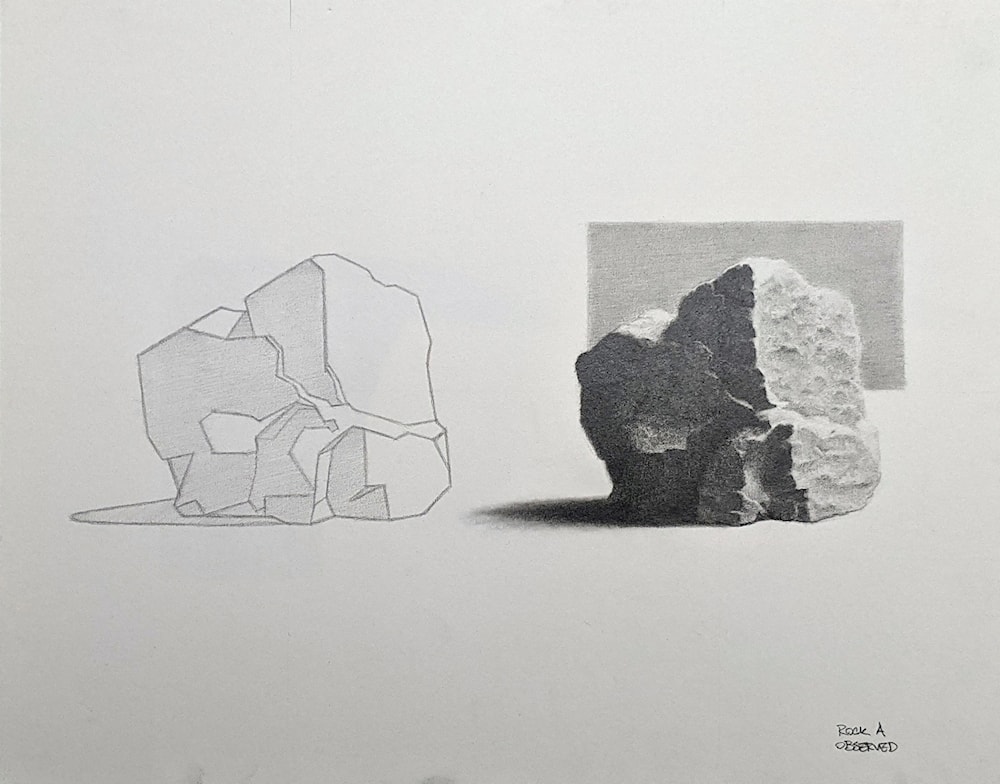 At the Georgetown Atelier, students first learn core subjects, such as constructive anatomy, value studies, perspective, cast drawing, etc., working from observation. Then students learn how to extend beyond observation into the inventive. The 'Rock Project' is one such example of a bridge between the observational and the imaginative. Here, students first draw a rock from observation, and study its visual properties (planar vs. round, quality of texture, lighting, etc). Then students draw a rock from 'imagination', informed by their observational studies of the real rock.