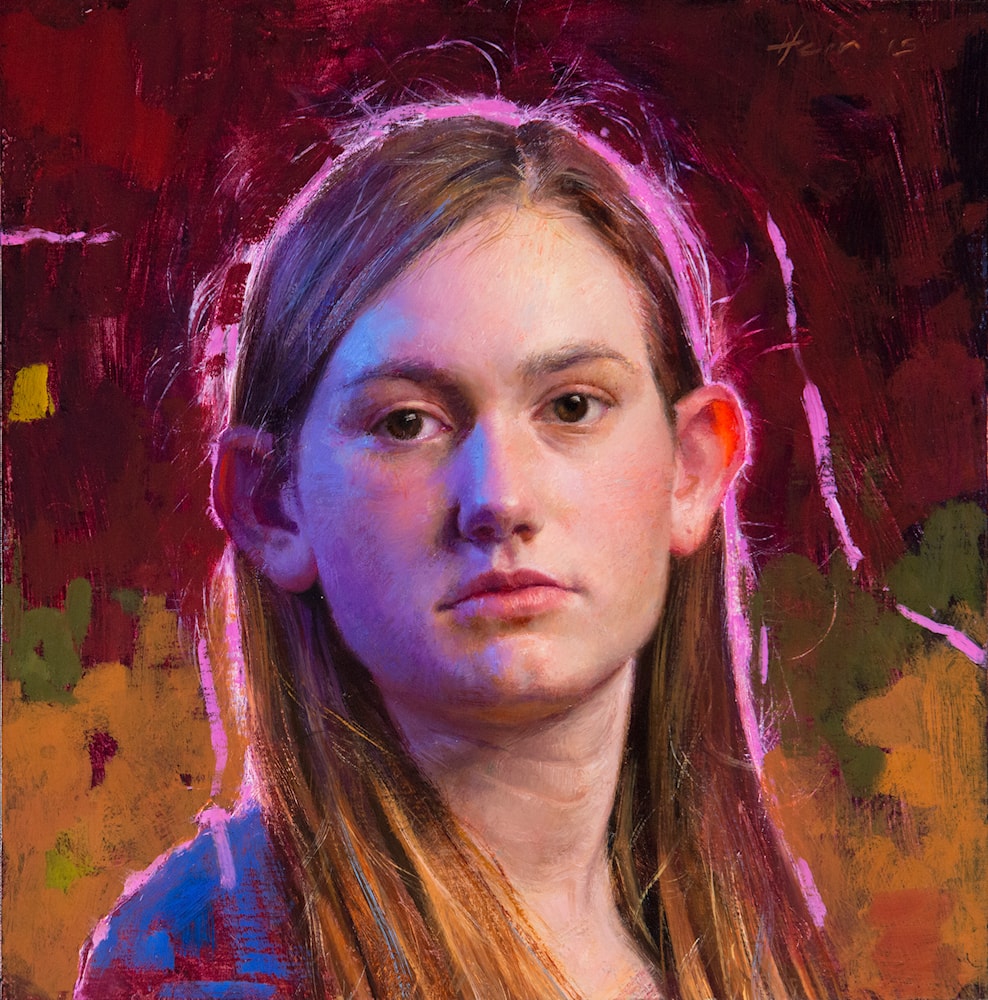 This painting of Ju Ju is a portrait of the artist’s youngest apprentice at age 14. Capturing her intelligence and a sense of seriousness, the artist depicts that point in a girl’s life where she is transforming into a woman. The lighting in this painting is of particular interest, as there are two distinctive light sources; one coming from the sitter’s upper left illuminating her face, and the second from behind her head, causing an earthy halo from man made spot lights to appear around the rim of her hair. The artist accurately captured the sensation of this phenomenon with hot pink, wild, brushstrokes.