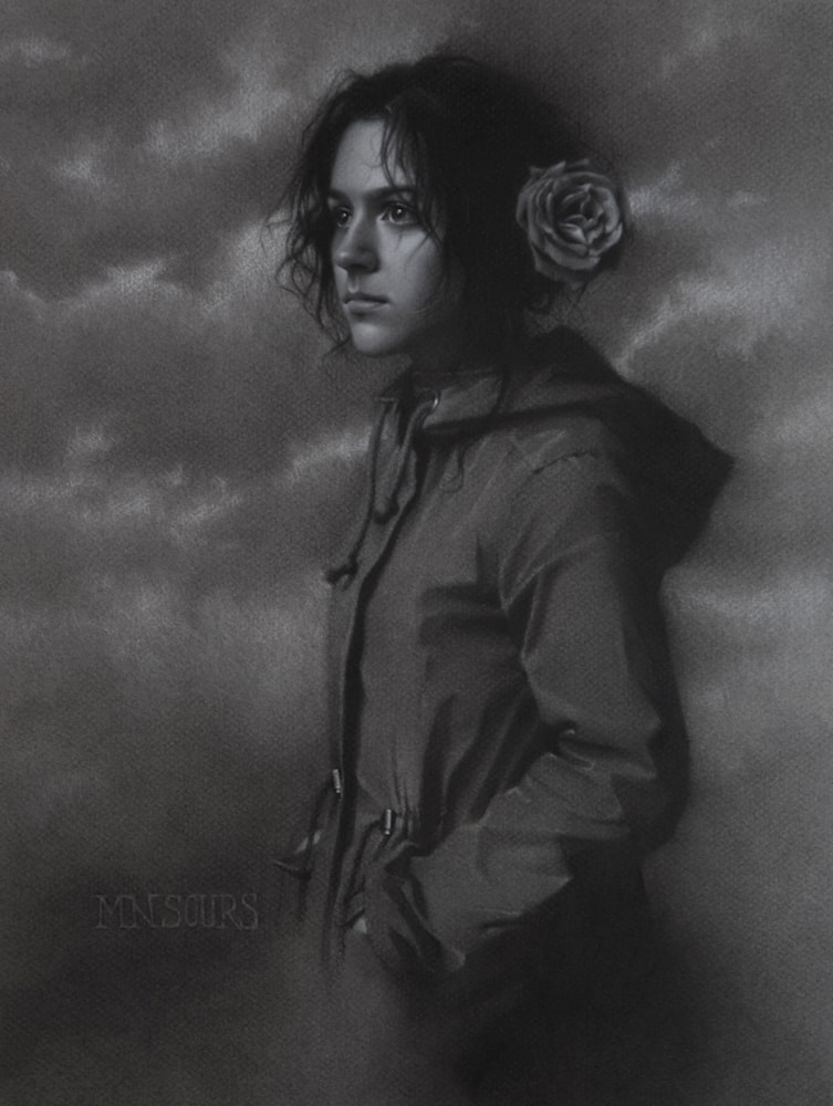 "This drawing is a character study of a dear friend. The model is both poised and wise for her young age. She is naturally contemplative and empathetic to a fault. But even in her youth she has been through a lot and over the past few years I have witnessed how her life experiences have shaped her. Renewal is defined as being made new or strong again. The model is currently in a moment of transition, somewhere between childhood and womanhood. The bloom woven into her curly hair and the storm clouds behind her represent both the beauty and bleakness of life. Yet both are transient. She stands peacefully in the present moment, shaped by her past and looking forward with purpose towards her future." - Meghan Sours