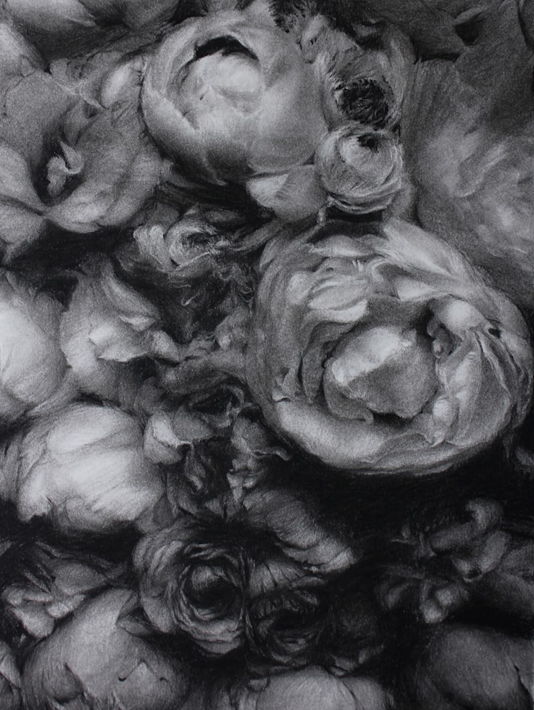 A drawing of an arrangement of roses and peonies that caught my eye. The contrast in values the softeness of the petals and the drama that I could feel in the simple but complex representation of them in charcoal.
