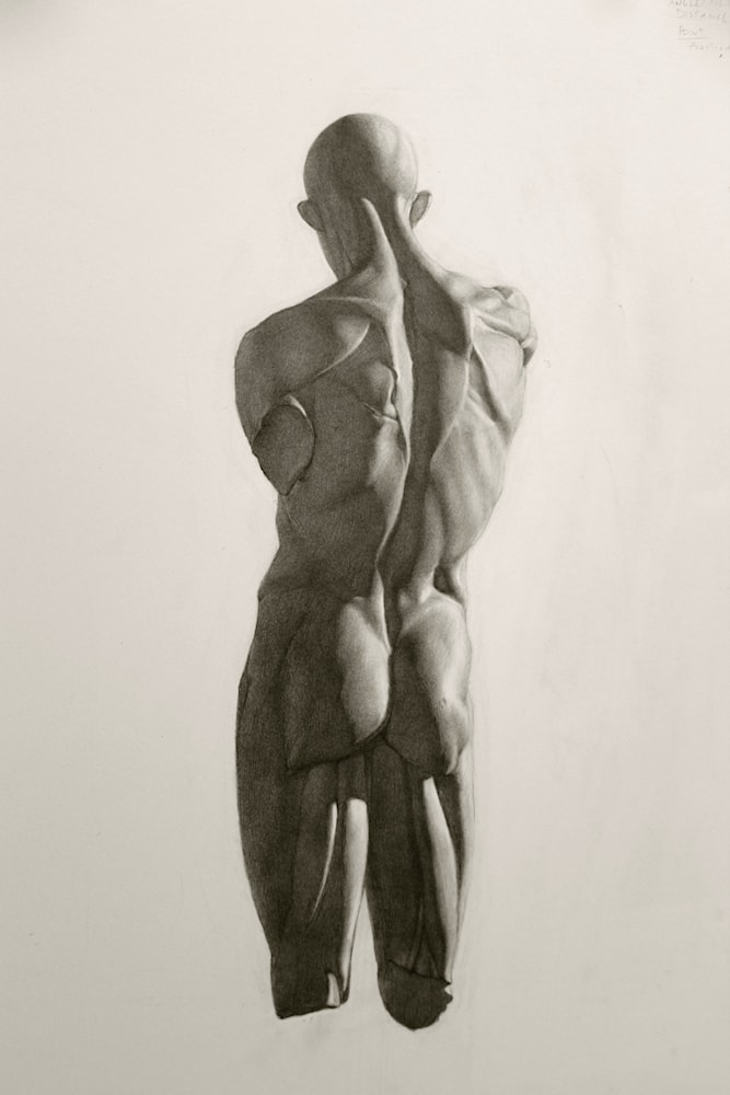 A cast drawing of L'Ecorche, The Flayed Man, by Jean-Antoine Houdon. Drawn from the cast under direct lighting. Academic cast study of light and form.