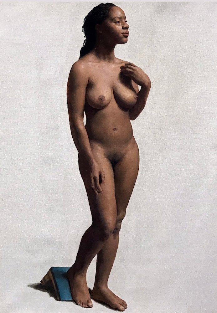 The blank background emphasizes Fatima's deliberation. The focus is on her mental state, rather than her place in an environment.
