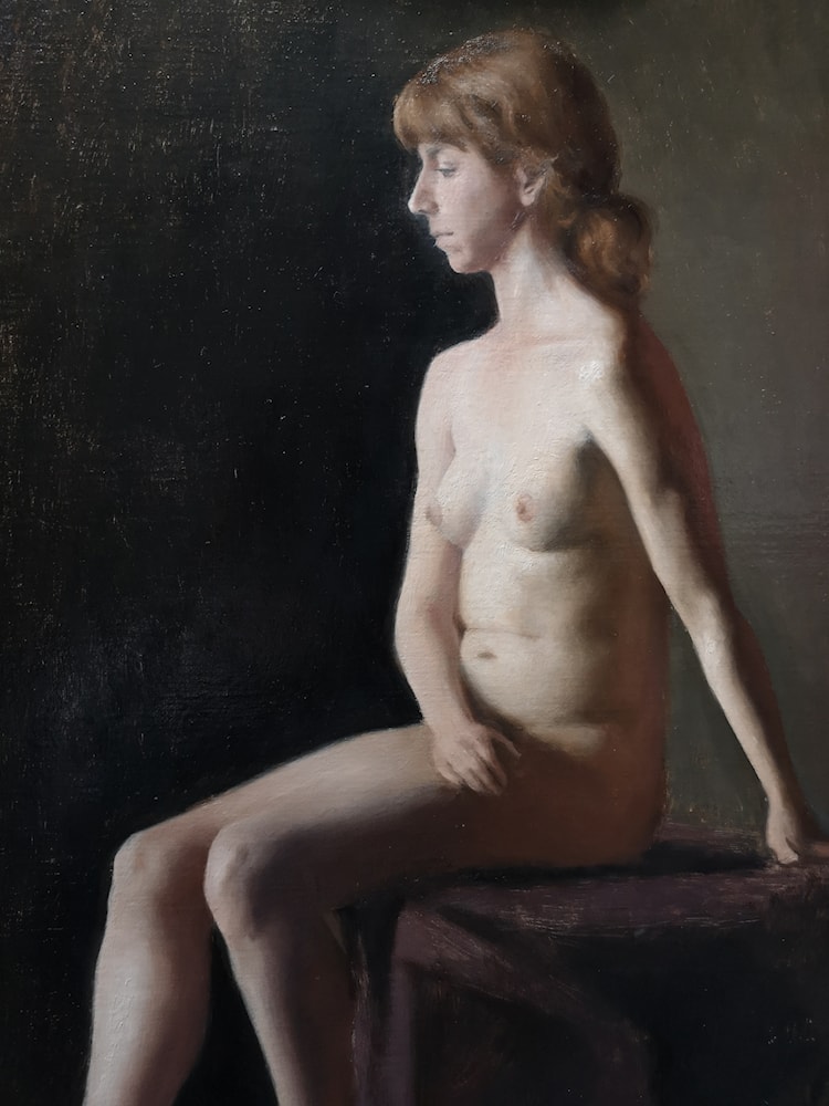A long pose figure painting. The main image over exaggerate the transparency of the background. The close up shows a little bit more texture building on the torso.
