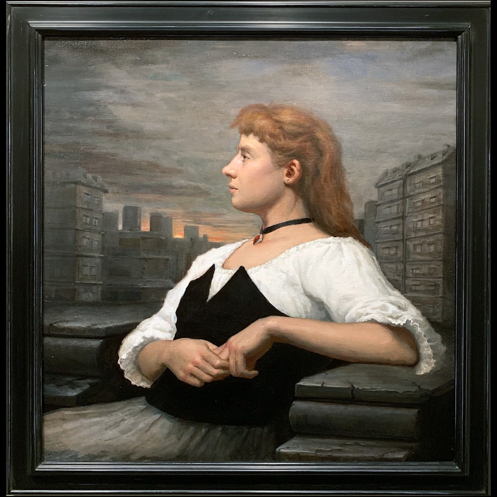 "In this portrait, an idealized old-world beauty/ideal meets the coming storm of industrialization. She is unperturbed, but the storm clouds are only beginning to gather."