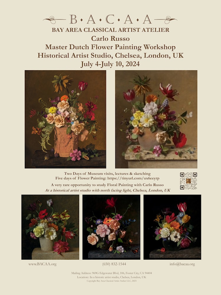 Instructor Carlo Russo will lead a Master Dutch Flower Painting Workshop in a historic artist studio in Chelsea, London, UK with exquisite north facing windows. The workshop will include 2 days of museum visits and lectures by the instructor, and five days of painting in the studio. For centuries, artists and admirers have marveled at the exquisite floral bouquets painted by the Dutch artists of 17th century Holland. This is an amazing opportunity to learn the techniques of the old masters.